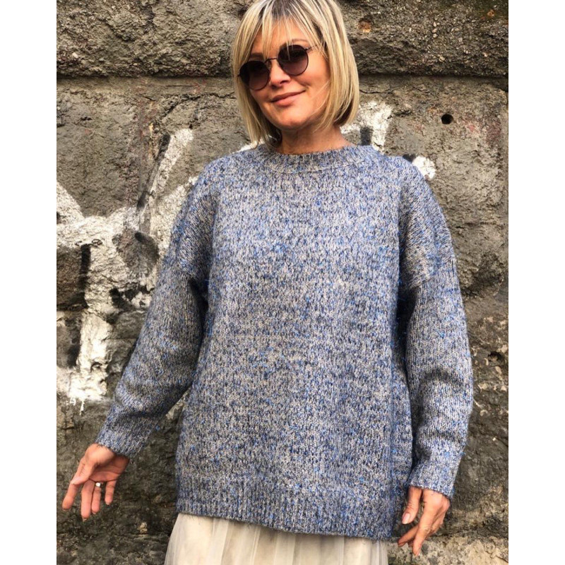 В'язаний светр з великою меланжевою пряжі. З круглою горловиною і стирчать «волосками» з люрексу