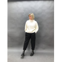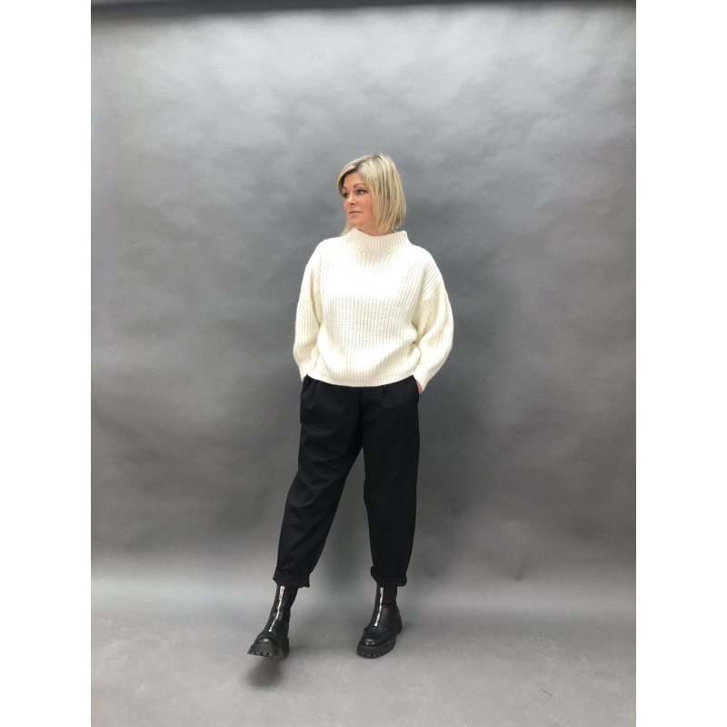 В'язаний светр великою в'язкою. По нижньому краю светра та по манжетах гумка. комір стійка, також пов'язаний гумкою. Светр виконаний у стилі "оверсайз"