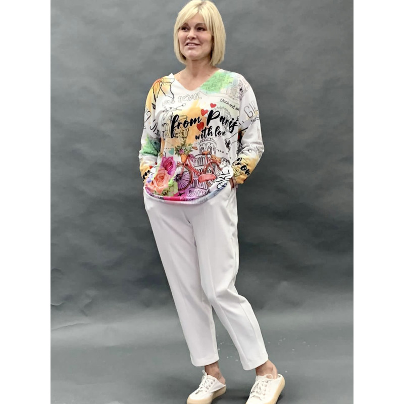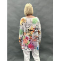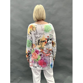 Віскозна футболка оверсайз з приспущеною лінією плеча та яскравим гумористичним принтом. Край горловини оброблений не нав"язливим люрексом.
