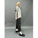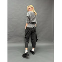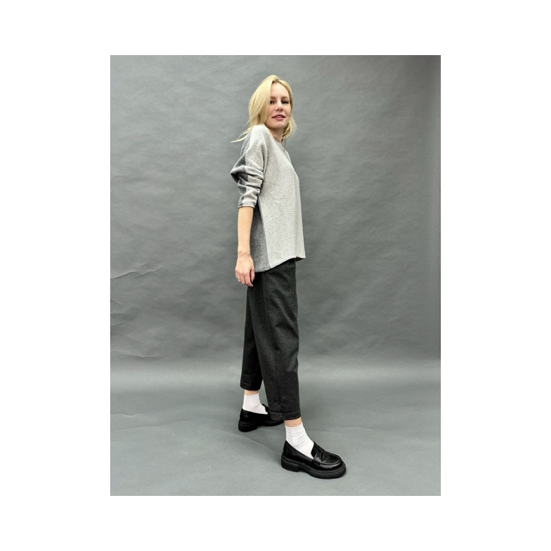 Светр, пов'язаний поперечною в'язкою, зліва направо з двох відтінків сірого. Горловина «човником» дозволяє носити його світлою чи темною стороною вперед. Светр красиво виглядає і навипуск, або заправлений або перетягнутий широким натуральним ШКІРЯНИМ ПОЯСОМ з різної форми пряжками - круглими, прямокутними.