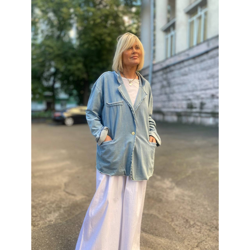 Леки трикотажий жакет без підкладки в гранжовому сильо вилинявому блакитному кольорі. Шви не приховані один гудзик та кишені по боках.