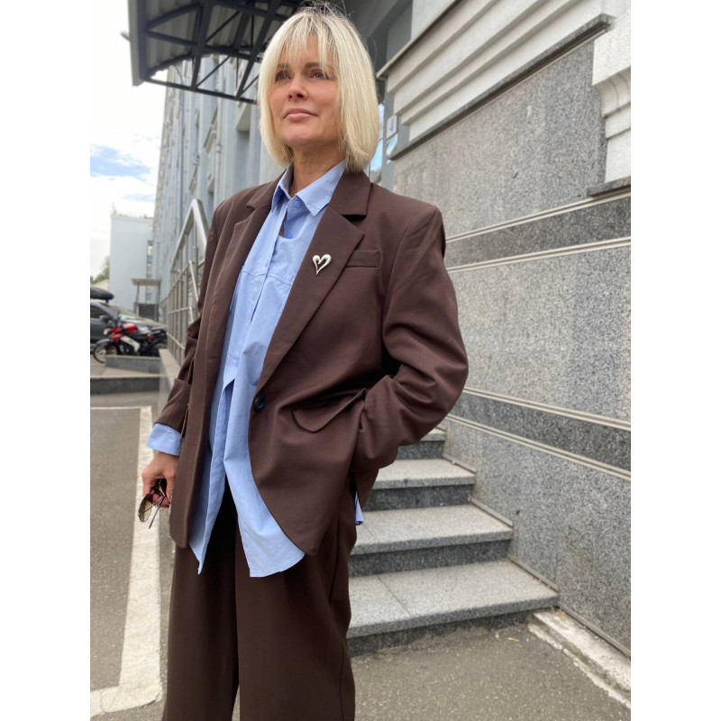 Оригінальний довгий піджак злегка приталений з подвійними клапанами та широкі злегка укорочені штанни з манжетами. Поеднує діловий стиль і стилль преппі в модному шоколадному кольорі.